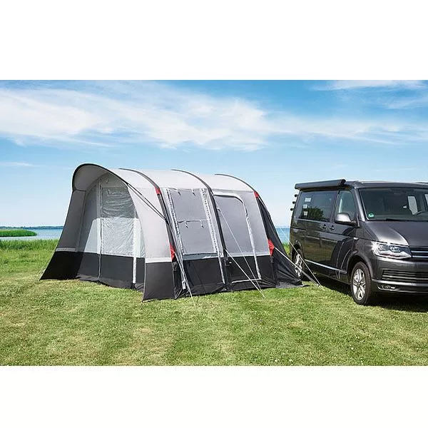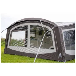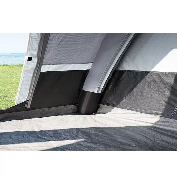 Durch die vielseitige, flexible Wandgestaltung ist das Vorzelt sehr komfortabel. Der Eingang in der Vorderwand ist mit einem Moskitonetz mit Reissverschlussbefestigung ausgestattet, ideal zum Lüften und zum Schutz vor lästigen Insekten. In jeder Seitenwand befindet sich ein wegrollbarer Eingang. Die grossen Seitenwand-Fenstersegemente sind mit grossen Lüftungsfenstern (1/2 Gaze, 1/2 Klarfolie) ausgestattet und lassen sich bequem hochrollen.