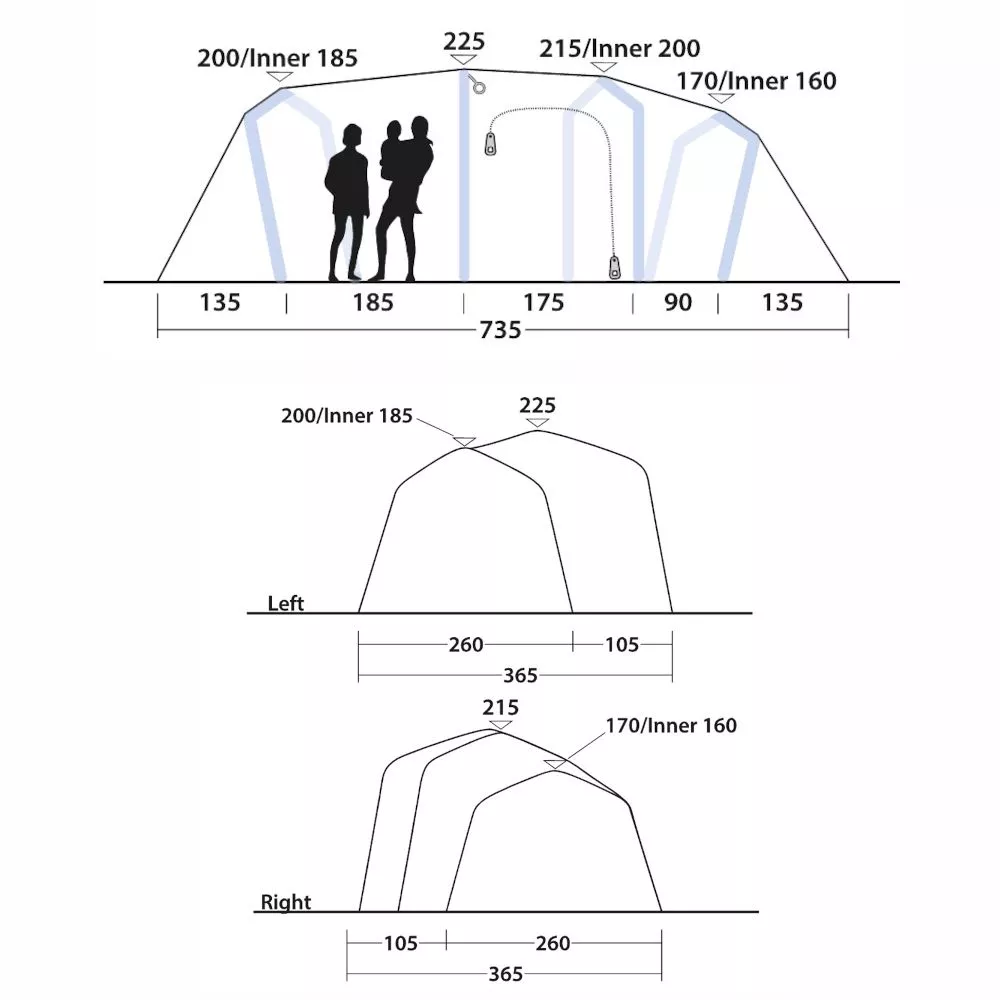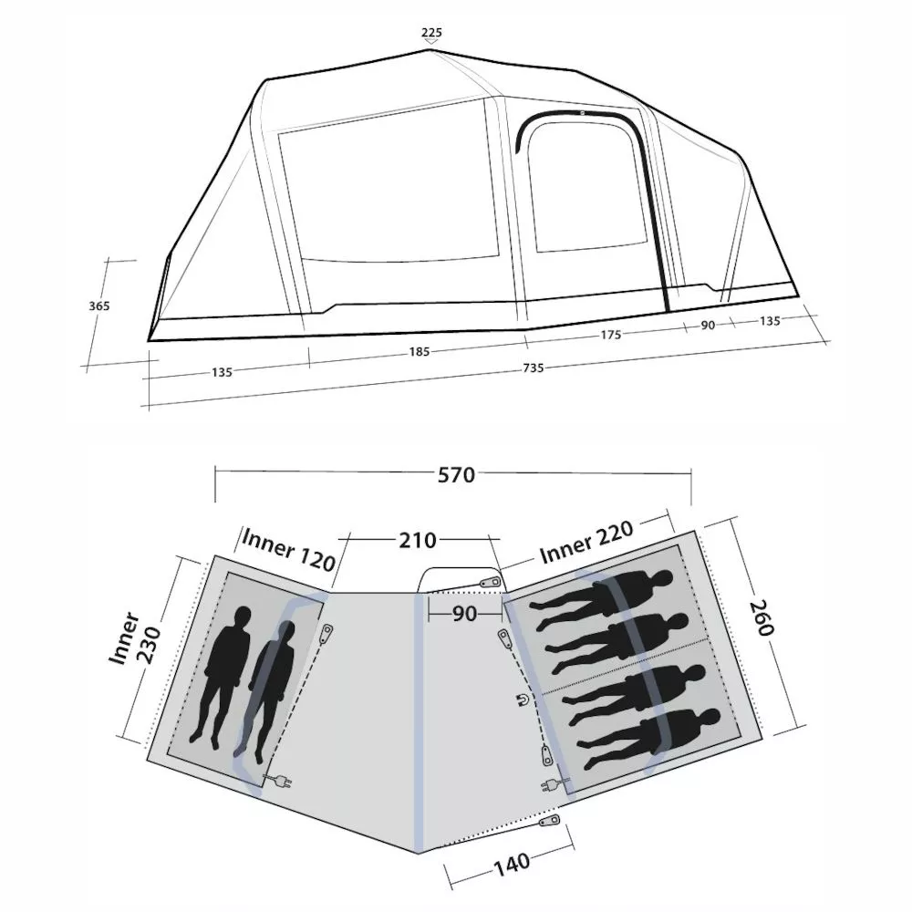 Die 2,20 Meter lange abgedunkelte Premium-Schlafkabine hält eine Liegefläche für bis zu vier Personen bereit. Optional per Reissverschluss-Trennwand abteilbar in drei Schlafkabinen. Mit dem zusätzlichen abnehmbaren Innenzelt für zwei Personen, bietet das Tunnelzelt insgesamt bis 6 Personen einen gemütlichen Schlafplatz. Ein weiteres Highlight ist die Quick & Quiet Schlafkabinentür, die es ermöglicht, eine der beiden Schlafkabinen schnell und geräuschlos zu verlassen. Durch das eingearbeitete Magnetband öffnet sich die Tür ohne lästige Geräusche nahezu wie von selbst. Wahlweise kann die Tür auch traditionell mit Reissverschluss geöffnet werden.