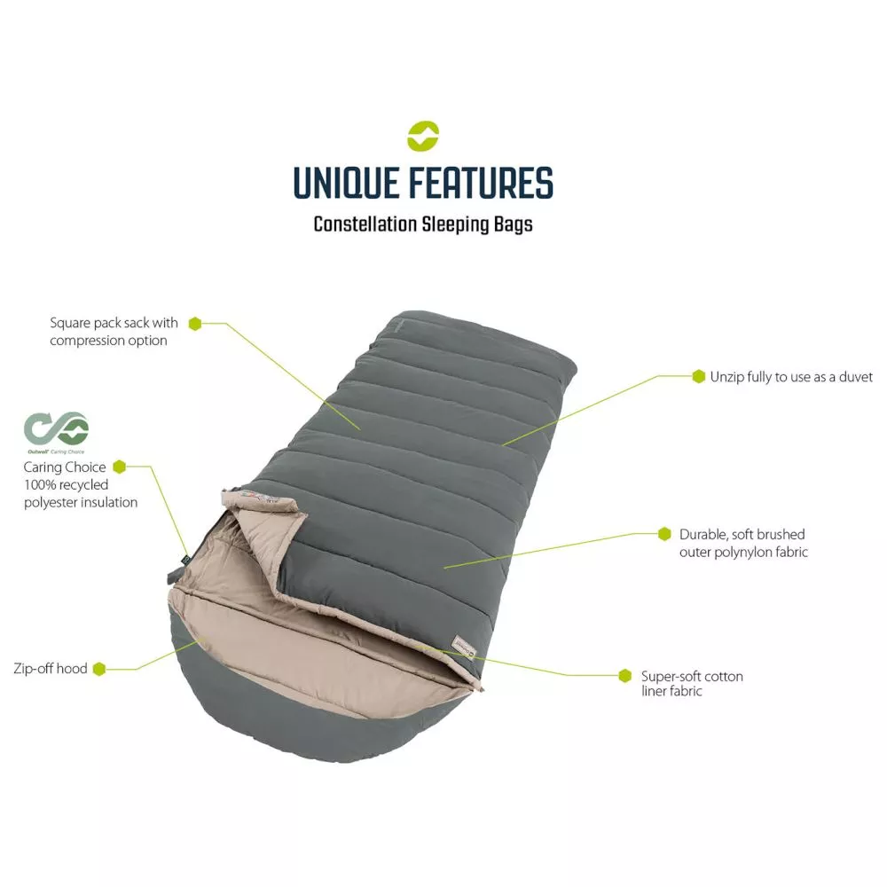 Den Outwell Constellation bietet ein üppiges Platzangebot und kann nach Wahl als Schlafsack oder geöffnet als grosse Decke verwendet werden. Der strapazierfähige, extrem weiche und gebürstete Aussenbezug gewährleistet in Verbindung mit dem Innenbezug aus 100% Baumwolle und der Isofill-Premiumfüllung allerbesten Campingkomfort.