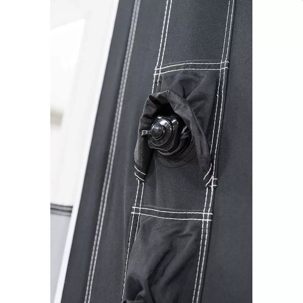 Im Vorzeltdach sind 2 Fenster integriert, was garantiert, dass genügend Tageslicht ins Zeltinnere gelangt. Dank der schönen Fenster hast du immer einen wundervollen Ausblick nach draussen. Zudem kann so viel Tageslicht ins Zeltinnere gelangen. An heissen Tagen kannst du die Vorderwände zur Seite aufrollen. Das schafft ein angenehmes Raumklima und bietet viel frische Luft. Zudem ist es möglich die Seitenteile abzunehmen. Zippe hierzu die Wände einfach per Reissverschluss ab. Wenn dir das allerdings zu offen ist, gibt es auch die Möglichkeit die Fliegengitter in den Seitentüren und dem rechten Fenster zu nutzen. Auch der Zugang zum Fahrzeug ist geleistet. Die Rückwand hat zwei Türen, die mit Reissverschlüssen geöffnet werden können. Damit du nicht durch das ganze Vorzelt laufen musst, hat die Schleuse zum Fahrzeug auch Türen die flexibel per Reissverschluss geöffnet oder geschlossen werden können.
