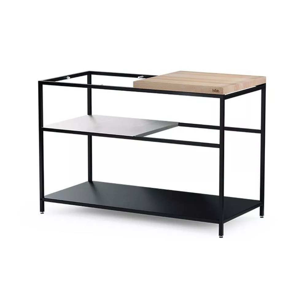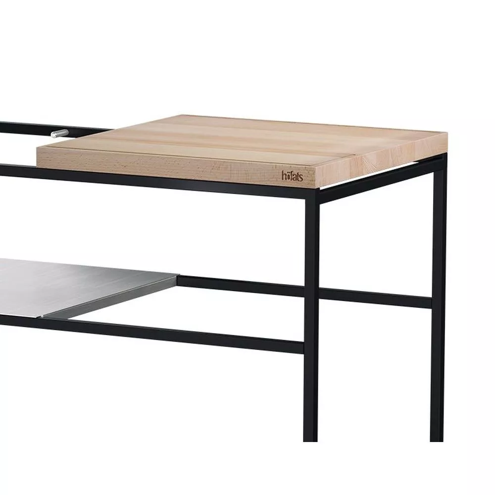 Die robuste und langlebige Küche besteht aus einem geschweissten Stahlrahmen mit integrierter Aufnahmeoption für BOWL, BOWL 57 oder BOWL 70 und bietet Ablage- und Arbeitsflächen auf drei verschiedenden Ebenen. Die Einlegeböden aus pulverbeschichtetem Stahl und gebürstetem Edelstahl bieten ausreichend Platz für zahlreiche Grillutensilien, während die massive Holzarbeitsplatte mit Saftrille auf der obersten Ebene dir die Zubereitung in angenehmer Arbeitshöhe und sicherem Abstand zu den Flammen ermöglicht. Beide können bei Bedarf auch den Platz freigeben für die optionalen Edelstahlbehälter, die in den Stahlrahmen eingesetzt werden können und alle Zutaten für dein Menü über dem Feuer beherbergen.
