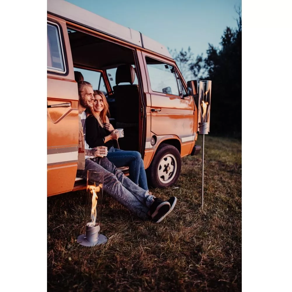 Mit dem Höfats Spin 120 Standfuss lässt sich die Höfats Spin 120 Gartenfackel schnell und unkompliziert zum Tischfeuer umbauen und zaubert somit Lagerfeueratmosphäre auf dem Balkon, Terrasse oder sogar in deinem Wohnzimmer. Soll die Fackel frei stehen, wird der massive Fuss für das SPIN 120 ohne Werkzeug montiert. Er ist ein richtiger Hingucker, ganz egal ob du eine Grilparty mit Freunden planst oder es für einen gemütlichen Fernsehabend im Wohnzimmer nutzt. Der Kamineffekt dieses Windlichts sorgt für angenehme Wärme und kuschelige Stimmung.