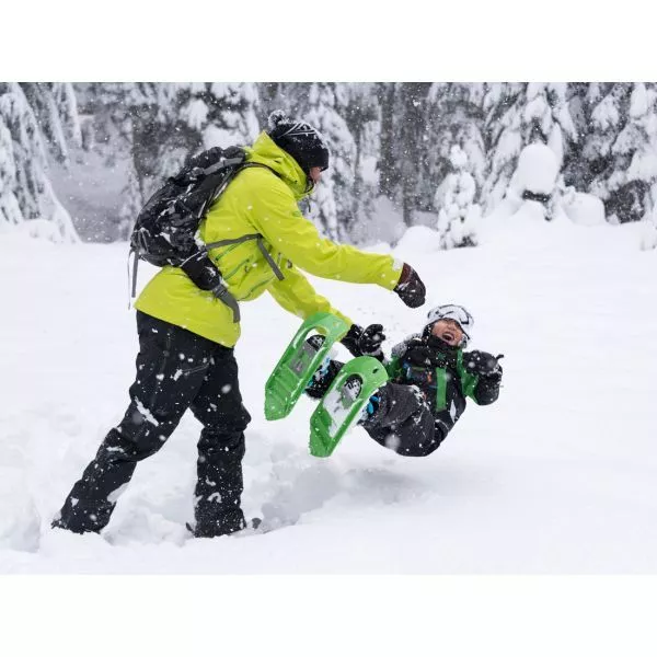 Die Schneeschuhe MSR Tyker sind kinderfreundliche Schneeschuhe mit bester Leistung. Mit einem Gewicht von bis zu 930 g sind sie leicht und schränken die Kinder nicht in ihrer Bewegung ein. So können auch Kinder mit kleineren Schrittlängen an einer Schneeschuhwanderung teilnehmen. Die Schuhe verfügen über Steigeisen aus Stahl und kinderfreundliche formgepresste Steigleisten für rundum gute Trittsicherheit und maximale Sicherheit. Auch kleine Hände können die einfachen Riemen verwenden. Zudem passen fast alle Kinder-Schuhgrössen dazu.