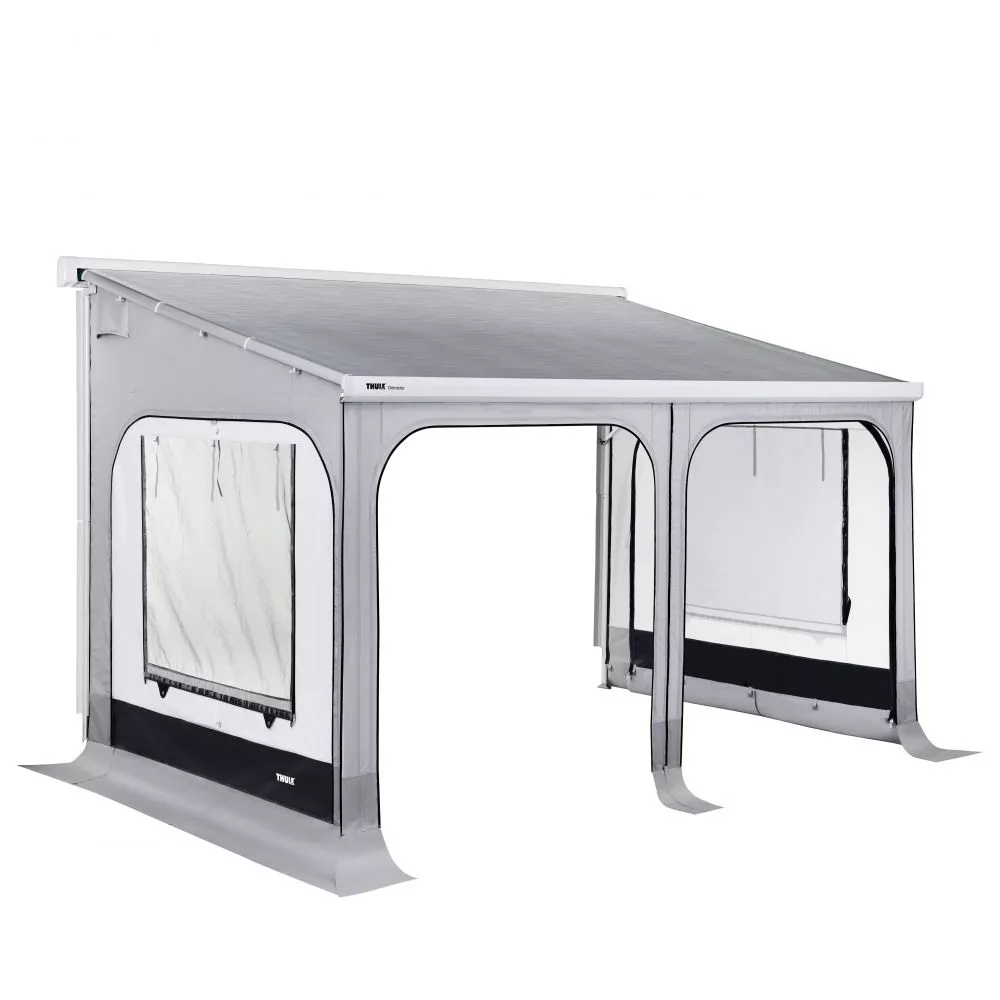 Das Markisenzelt Thule Panorama für die Thule Omnistor 5200 Markise besteht wie das bewährte Safari Residence aus einer Vorderwand und zwei Seitenteilen. Es bietet die gleiche hervorragende Stabilität und ist genauso leicht aufzubauen. Die Vorderwand wird einfach in die Frontleiste der Markise eingeschoben und mit den Seitenwänden, die durch ein Klemmprofil am Markisentuch befestigt werden, mittels Reissverschluss verbunden. Durch die grossen Panoramafenster ist für mehr Lichteinfall und besseren Blick nach draussen gesorgt. Die Frontfenster können vertikal geöffnet, als Tür, oder horizontal geöffnet, zum Lüften, genutzt werden. Alle Teile sind vollständig abnehmbar. Für ausreichende Belüftung ist dank der beiden in den Seitenwänden integrierten Belüftungsstreifen auch bei geschlossenem Zelt gesorgt. Beide Seitenfenster sind zudem mit Moskitonetzen ausgestattet. Das Markisenzelt Thule Safari Panorama ist aus Airtex gefertigt, einseitig mit Acrylat beschichtet und mit einem teflonbasierten Finish imprägniert. Durch die Fungizidbehandlung wird das wasserabweisende, waschbare Material wirksam vor Pilz- und Schimmelbefall geschützt. Lieferbar in zwei Höhen, Höhe medium wird bei einer Montagehöhe von 2,3 – 2,44 m (gemessen von der Unterkante der Markisen-Kassette bis zum Boden), Höhe large bei einer Montagehöhe von 2,45 – 2,59 m und Höhe extra-large bei 2,6 – 2,74 m benötigt. Lieferung erfolgt inklusive Packtaschen und Wagenschürze.