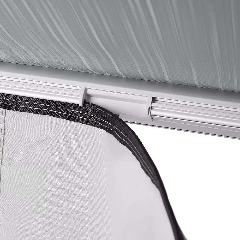 - die Vorderwand wird einfach in die Frontleiste der Markise eingeschoben und mittels Reissverschluss mit den Seitenwänden verbunden