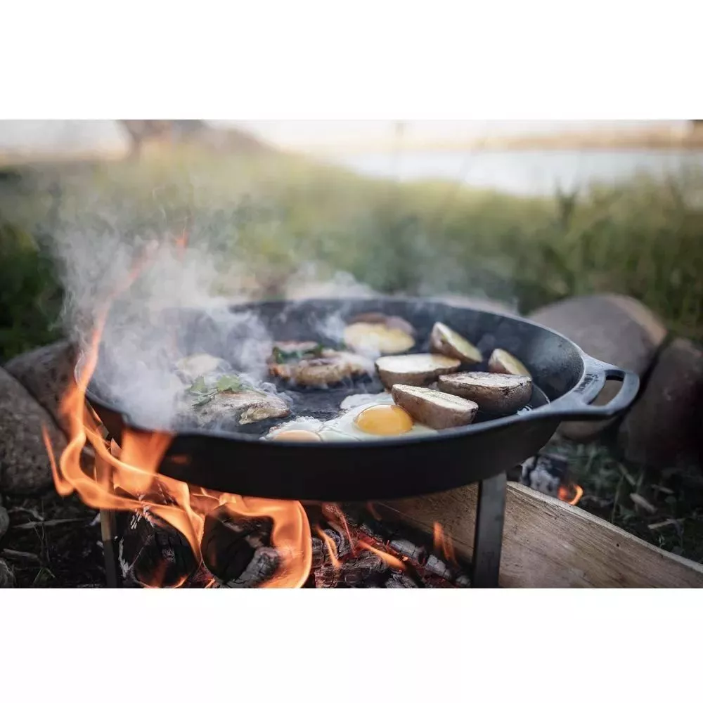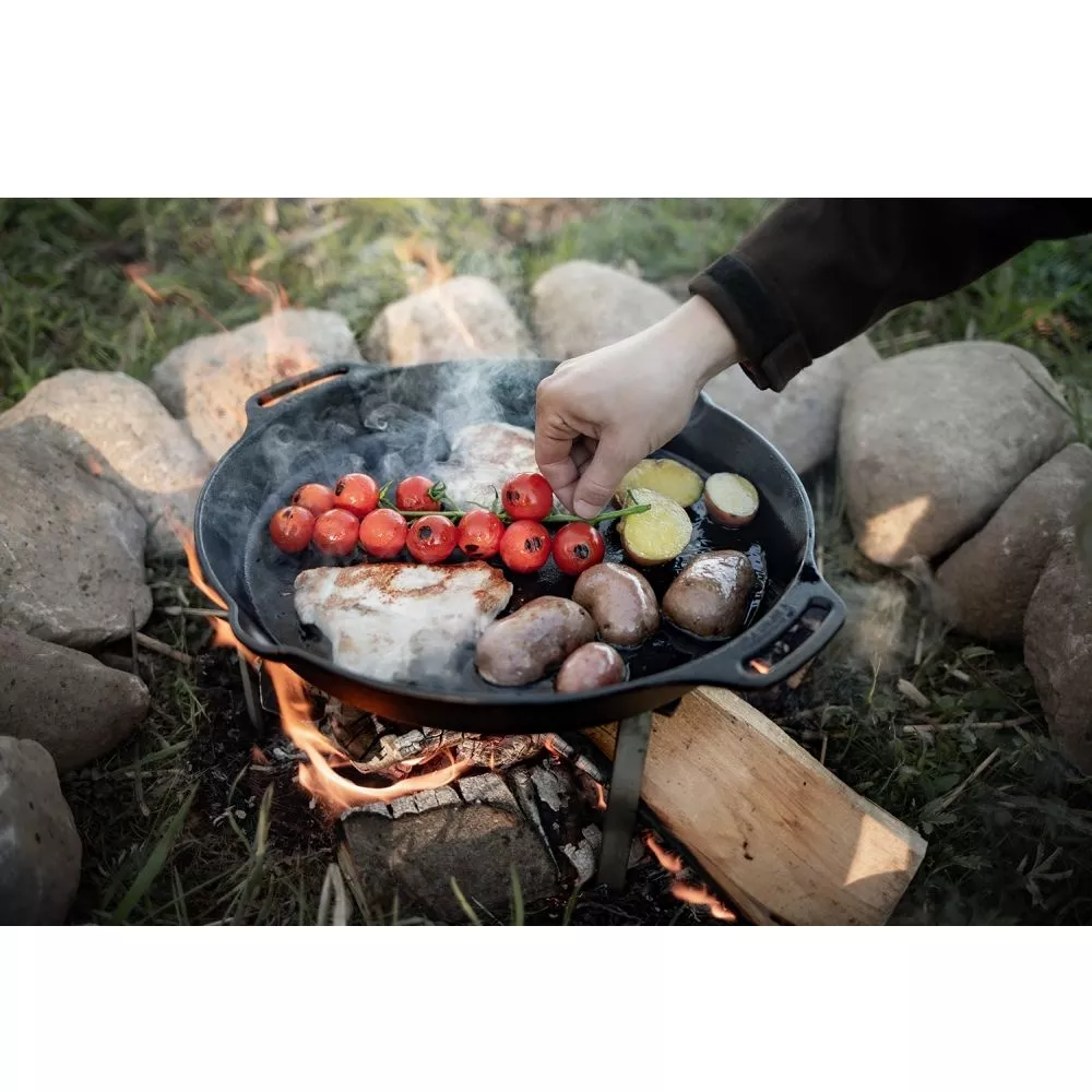 Du kannst die Feuerpfanne nicht nur auf dem Elektro- oder Induktionsherd, über der Gasflamme oder im Backofen verwenden. Auch auf einer Kochstelle im Freien, auf einem Lagerfeuer oder auf einem passenden Grill macht sie eine gute Figur. Schmoren, anbraten oder rösten – in der Feuerpfanne wird jedes Gericht zum Genuss.