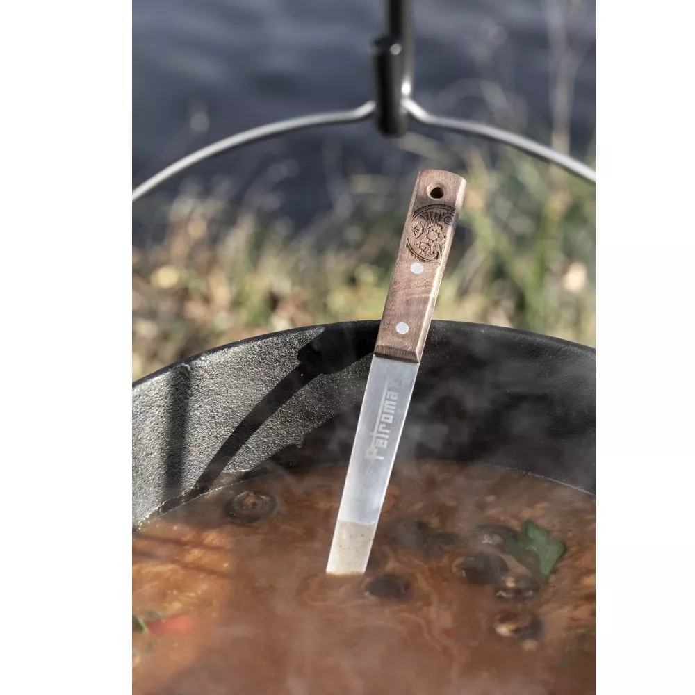 Stehts griffbereit wird deine Petromax Schöpfkelle mit Hilfe der Öse im Griff an einem Ast oder einem Haken in der Lagerfeuerküche aufgehängt. So hast du sie jederzeit zur Hand, wenn der Eintopf servierfertig ist.