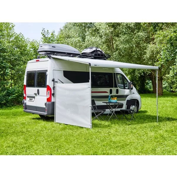 Der sich selbst aufrollende Thule Windscreen aus pflegeleichtem PVC-Gewebe ist 1,38 Meter hoch und bis zu 3 Meter ausziehbar. Die fahrzeugseitige Befestigung erfolgt am Stützfusshalter der Markise, durch die angenähten Klettbänder kann er an einem Markisen-Stützfuss befestigt, aber auch mittels beiliegenden Abspannleinen und Heringen frei abgespannt werden. Die Lieferung erfolgt inklusive Tragetasche und Montagematerial.