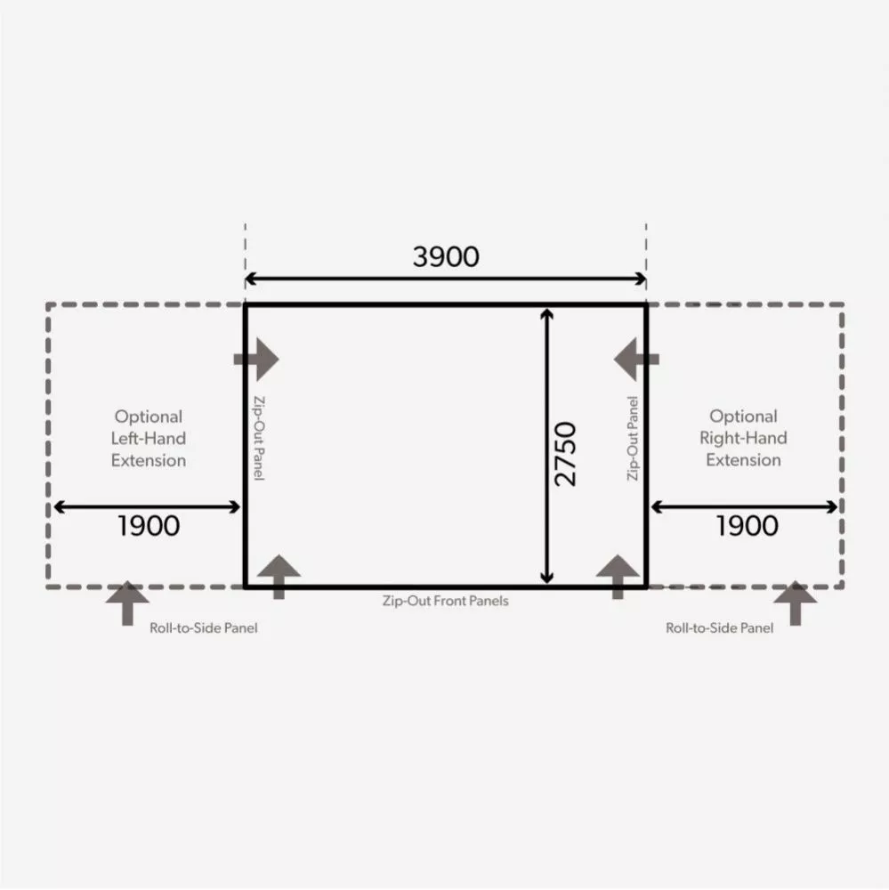 optional erhältliches Front-Vordach, Side Wing und Vorzelterweiterungen