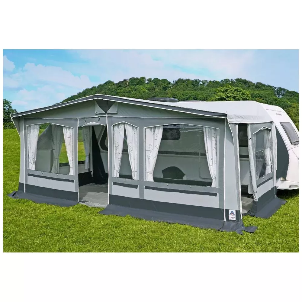 Das Triest Vorzelt von Hahn bringt alle praktischen Eigenschaften mit, die es für einen entspannten Campingurlaub mit der Familie braucht. Falls doch einmal mehr Platz benötigt wird, lässt sich das Wohnwagenvorzelt jederzeit mit einem separat erhältlichen Erker erweitern.