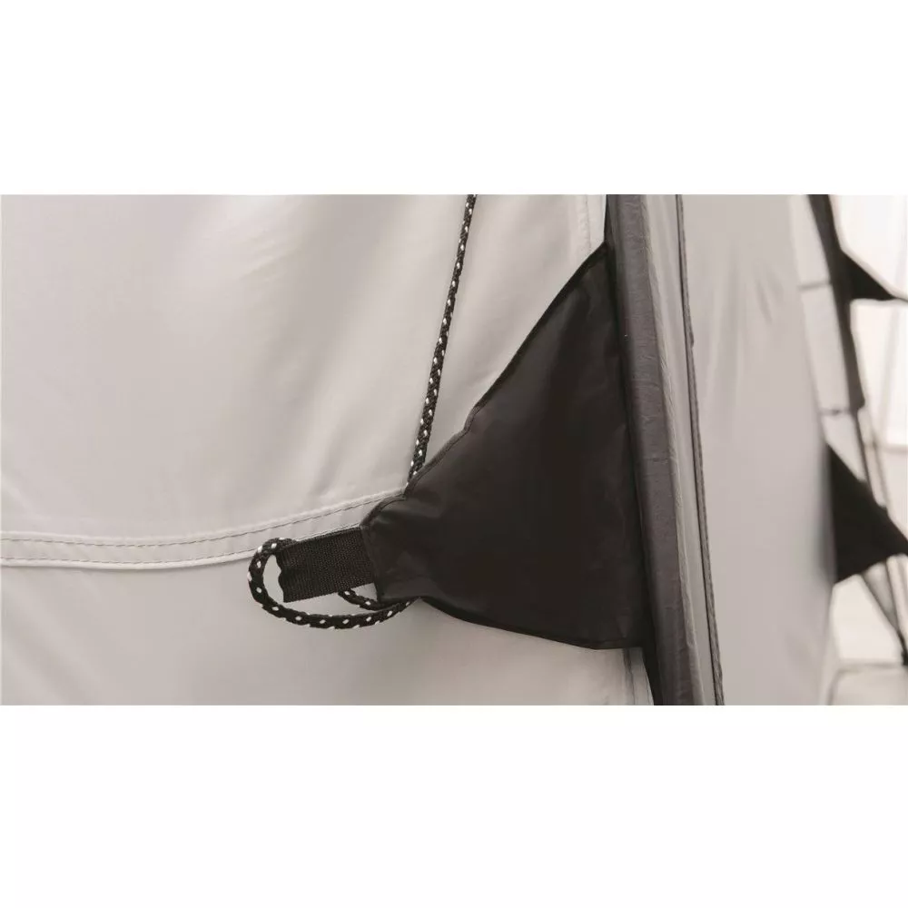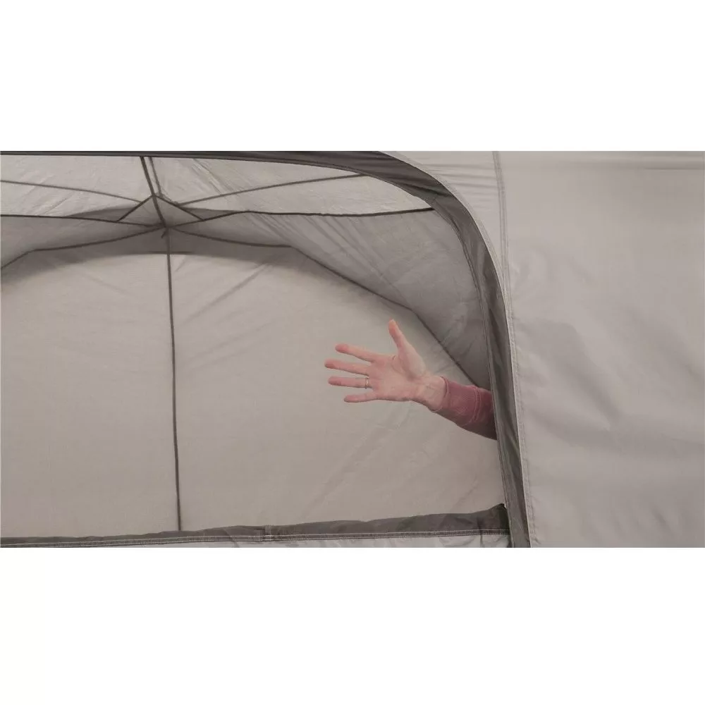 Im Pavillonzelt führt der offene, überdachte Wohnbereich ins wasserdichte Zelt im hinteren Bereich. Der abteilbare Schlafraum für bis zu sechs Personen lässt sich bei Bedarf auch als Lager- und Stauraum nutzen. Eingang und Fenster sind mit Vorhängen und Netzbelüftung ausgestattet. Der Schlafbereich mit Belüftungsnetz in Dach und Türe sowie ein angenähter Zeltboden, schaffen einen wohnlichen Raum und einen gemütlichen Zufluchtsort im Innenzelt.